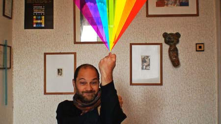 "Negative message (Middle finger)" 01'15. Neno Belchev (Bulgaria) This video aims to present Neno's visual interpretation of the world and the social environment, where he lives in, by showing seemingly well-known non polite gestures. Those gestures are matched by contradictory but very strong visual element (the RAINBOW/SPECTER), which if considered at one level, seem to be in conflict with one another both ideologically and visually. In fact, in favor of the dispute, the artist denies them. In other words: by negation, through denial, he affirms a favorable and positive opinion. As a result of it, the artist achieves a message with an irrational impact, which does not have to be considered by using logical thinking. In the video we observe seemingly barbarian or even savage attitude, which puts under question the achievements of the civilization, but the RAINBOW appearance changes the video meaning deep in its roots and makes it multileveled. In the other hand, during soviet era some of the Bulgarian artists were more or less opposition of the communistic government, but after fell down of the Berlin wall, the situation changed and for most of them it became difficult to find a place in the society – all life time they were opposition, now they didn't know how to be on the other side. It is kind of schizophrenic situation or at least contradictory. This video symbolically express these contradictory feelings very well.